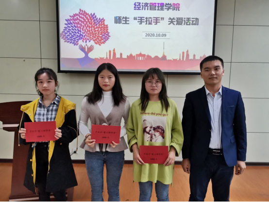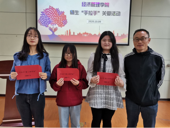 座谈会上,牛成亮老师介绍了师生“手拉手”关爱活动总结了2019年师生“手拉手”关爱活动的开展情况、取得的成果以及财务收支情况。2019年受资助员工代表王俪颖和舒晋香汇报了一年来在公司与老师的关怀下取得的成绩,并对“手拉手”关爱平台和各位老师的指导与帮助表达了感激之情。经贸系党支部书记马风涛和物流系党支部书记刘露介绍了2019年关爱活动开展情况以及部分同学在受资助期间的学习状况的变化,并向同学们提出建议,希望同学们增强主动性,老师们加强交流,只有师生携起手来才能真正帮助到每一位结对员工。随后,各党支部书记向2019年受资助员工发放了“爱心助学金”牛成亮老师通报了2020年关爱活动结对名单,2020年受资助员工代表褚玥进行了发言,表达了自己的感恩之情,表示在今后的学习生活中更加努力,成为一名优秀的老员工