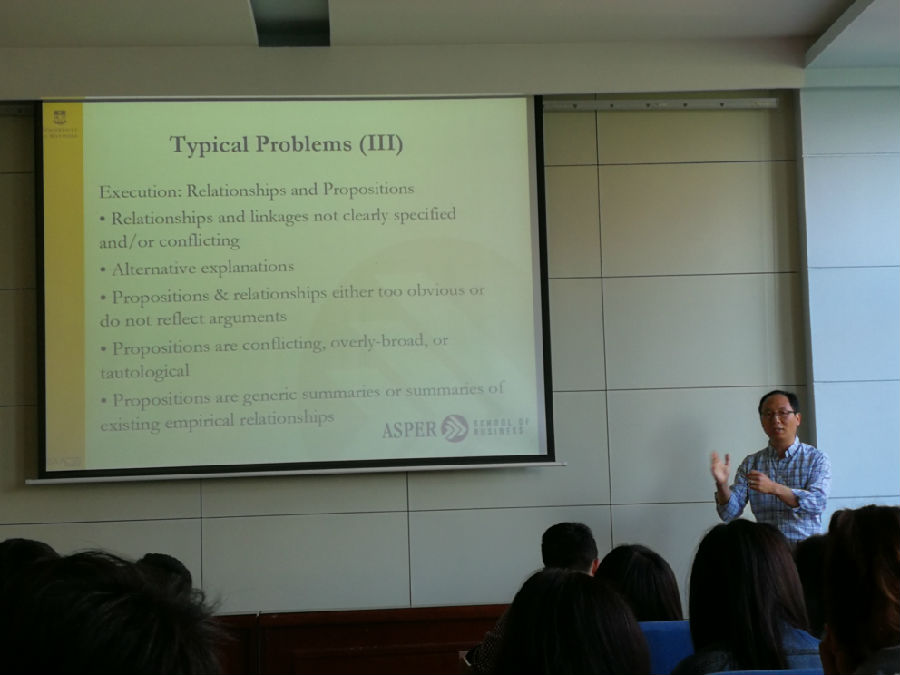 在报告中,高教授首先概括了管理学研究的主要发展趋势,重点介绍了企业层面的微观基础、理论驱动与现象驱动、多层次跨学科的研究设计;接着,高教授从评审专家和编辑的角度概括了论文写作方面的主要问题,包括假设与边界条件、论文结构、关系与命题、构念的定义与使用、研究范围与贡献;最后,高教授总结了理论构建的主要策略,重点介绍了多范式视角的理论构建方法。在互动环节,高教授与师生就研究选题、论文完善和科研合作等方面的问题进行了深入探讨。