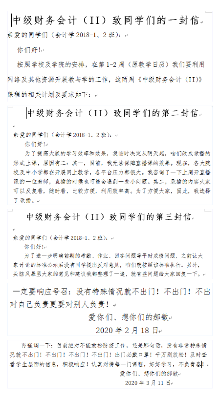 随着《中级财务会计(Ⅱ)》课程教学模式的不断改进,越来越多的员工参与进来。教学模式的每一次改进,都离不开员工的参与及建议,在不断调查、不断反馈的过程中,教师与员工的沟通交流越来越多,而且员工对课程教学设计的参与度也越来越高,你中有我,我中有你,更像是组建了一个大的家庭。作为家长,任课教师以“书信”为媒,向员工传递平时成绩标准、明确教学设计、教学模式等信息,使员工及时把握课程进度、安排及相关要求,能够更加从容的学习。此外,在防疫的关键时期,任课教师同样重视员工的思想政治教育工作,在“家书”也是反复强调要遵守纪律,做好防护,对自己负责更要对他人负责。