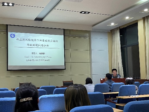 第五场:蔺康康同学以2021年发表在《中国管理科学》(基金委A类期刊)上的文章《收益流风险视角下双渠道供应链的囚徒困境问题分析》为例,分享了“双渠道供应链”等相关研究内容与成果。蔺康康同学以该论文为例提出了双渠道供应链的囚徒困境问题,从消费者渠道偏好以及厂商风险偏好视角出发研究供应链决策,运用收益流风险构造多阶段供应链效用函数,比较分析制造商和零售商之间的四种竞合策略组合对其利润以及效用水平的影响,进而研究制造商与零售商在收益流风险视角下对竞合策略的选择问题。