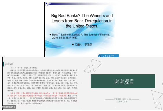 第二场:李浩然同学以发表在《The Journal of Finance》(FT50)期刊上的文章《Big Bad Banks? The Winners and Losers from Bank Deregulation in the United States》为例,分享了银行放松管制如何影响美国收入分配情况。通过计量经济学模型,用双重差分的方法评估了银行放松管制和收入不平等之间的因果关系,并对银行放松管制对美国收入分配的影响机制和渠道进行进一步的分析。研究得出,银行放松管制改善了收入不平等现象,使穷人变富,增加了对低收入劳动力的需求。银行放松管制对收入分配的影响渠道通过提高非技术工人的相对工资率和工作时间等方式实现。汇报完毕后,就李晶博士提出的作者通过怎样的方式深入剖析银行放松管制导致穷人和富人之间收入分配更加不平等的公平问题以及刘璐博士提出的在分析政策外生性时,平均基尼系数和银行放松管制散点图差异的原因问题进行了回答。