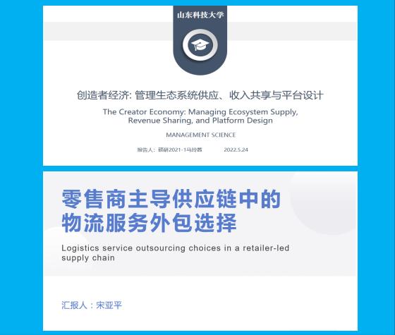 第二场:宋亚平同学汇报了题为《Logistics service outsourcing choices in a retailer-led supply chain》的文章,就物流服务外包选择策略问题展开讲解。该论文研究了零售商主导的供应链中的物流服务外包选择,从提供物流服务的主体方面分别构建了博弈模型,即由零售商自己提供物流服务或将服务外包给第三方物流服务提供商。通过比较各模型的均衡结果,探讨对零售商甚至所有链成员的最优策略选择。最后该文章基于成本分摊契约进行协调,达成了零售商、制造商以及第三方物流服务提供商的双赢局面,体现了该契约对供应链的价值。在分享完毕后,针对刘悦、朱广明等同学提出的有关论文的细节内容、数值模拟的参数设置等问题进行了探讨和交流。