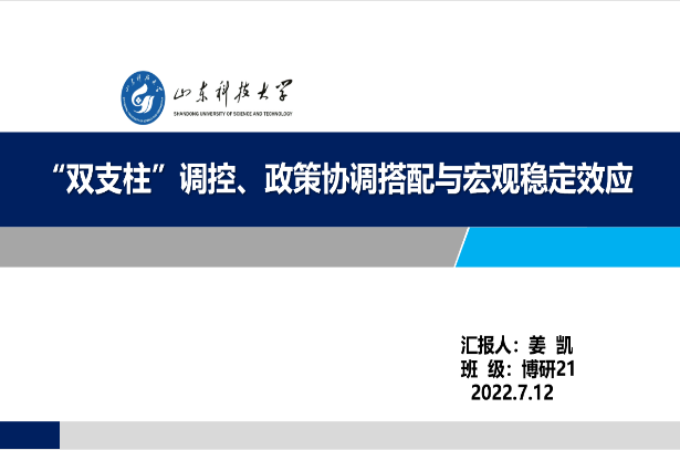 第一场:姜凯同学以马勇和付莉2020年发表在《金融研究上》的文章《“双支柱”调控、政策协调搭配与宏观稳定效应》进行了讲解。文章系统考察了货币政策和宏观审慎政策的组合在不同经济金融冲击下的宏观经济和金融稳定效应。本次报告结合文章内容和我国实际情况多角度进行阐述,使大家了解党的十九大提出健全货币政策和宏观审慎政策双支柱调控框架的意义。只有货币政策和宏观审慎政策之间相互协调配合,才能守住不发生系统性风险的底线,维护经济和金融体系的整体稳定。