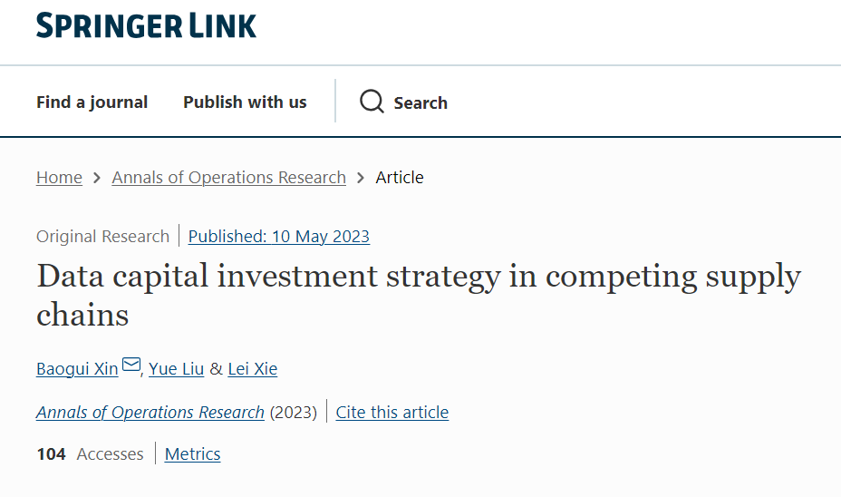 公司博士生刘悦(导师:辛宝贵教授)的论文“Data Capital Investment Strategy in Competing Supply Chains”在管理领域国际期刊《Annals of Operations Research》(SCI,IF=4.8,JCR三区)发表。