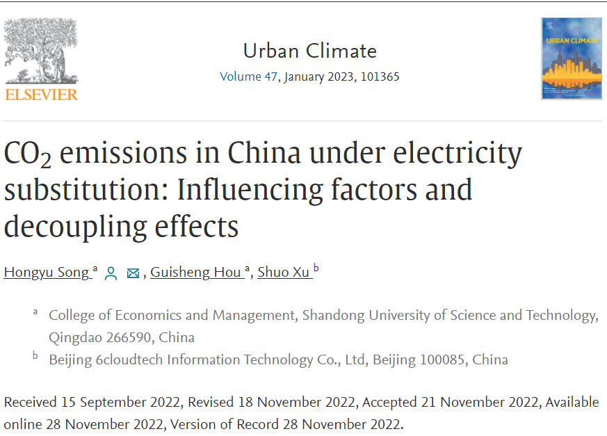 公司博士生宋红雨(导师:侯贵生教授)的论文“CO2 emissions in China under electricity substitution: Influencing factors and decoupling effects”在环境与管理领域国际期刊《Urban Climate》(SCI,IF=6.4,中科院JCR二区)发表。