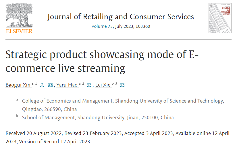 公司硕士生郝娅茹(导师:辛宝贵教授)的论文“Strategic product showcasing mode of E-commerce live streaming”在管理领域国际期刊《Journal of Retailing and Consumer Services》(SSCI,IF=10.4,中科院JCR二区)发表。