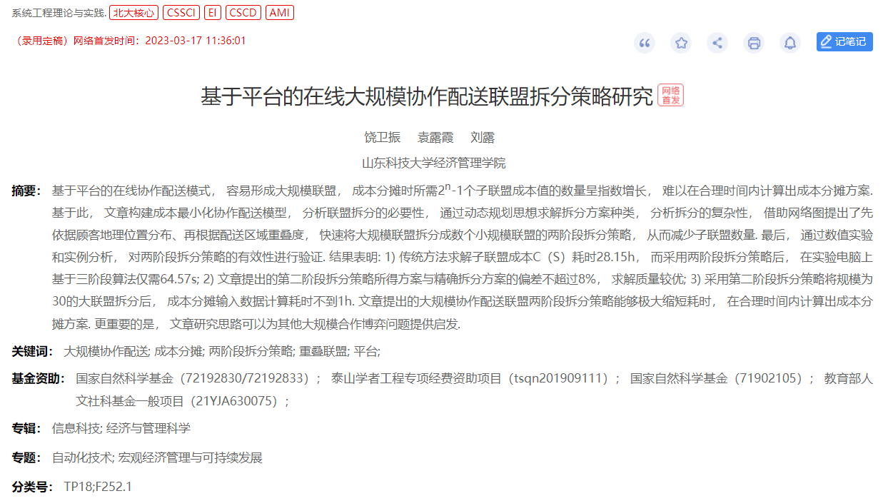 公司硕士生袁露霞(导师:饶卫振教授)的论文“基于平台的在线大规模协作配送联盟拆分策略研究”在管理学领域中文期刊《系统工程理论与实践》(CSSCI,IF=3.8)发表。