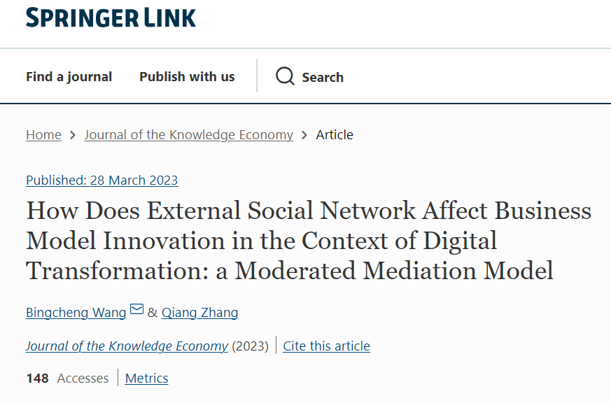 公司博士生张强(导师:王炳成教授)的论文“How Does External Social Network Affect Business Model Innovation in the Context of Digital Transformation: a Moderated Mediation Model”在经济学领域国际期刊《Journal of the Knowledge Economy》(SSCI,IF=3.3,中科院JCR四区)发表。