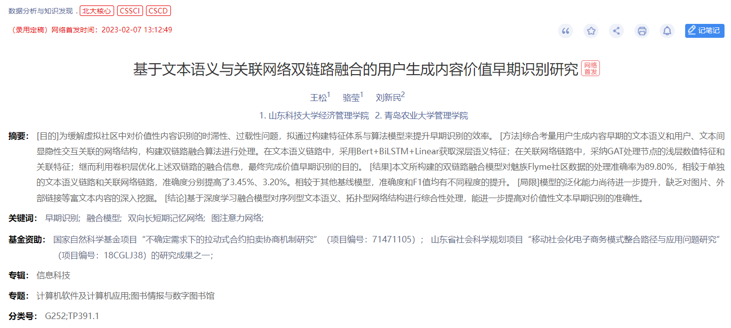 公司硕士生骆莹(导师:王松副教授)的论文“基于文本语义与关联网络双链路融合的用户生成内容价值早期识别研究”在中文期刊《数据分析与知识发现》(CSSCI,IF=3.3)发表。
