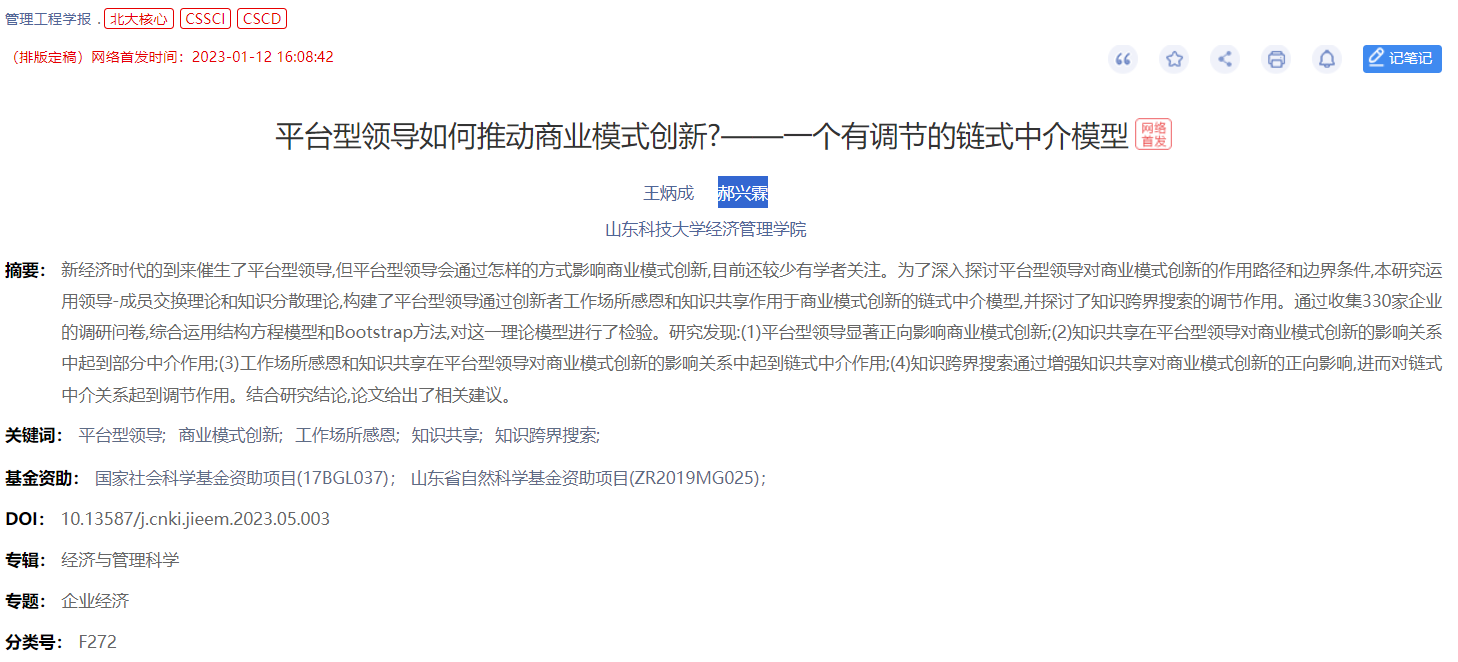 公司硕士生郝兴霖(导师:王炳成教授)的论文“平台型领导如何推动商业模式创新?——一个有调节的链式中介模型”在管理领域中文期刊《管理工程学报》(CSSCI,IF=4.1)发表。