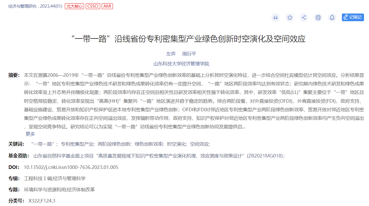 公司博士生左弈(导师:周衍平教授)的论文““一带一路”沿线省份专利密集型产业绿色创新时空演化及空间效应”在经济学领域中文期刊《经济与管理研究》(CSSCI,IF=6.5)发表。