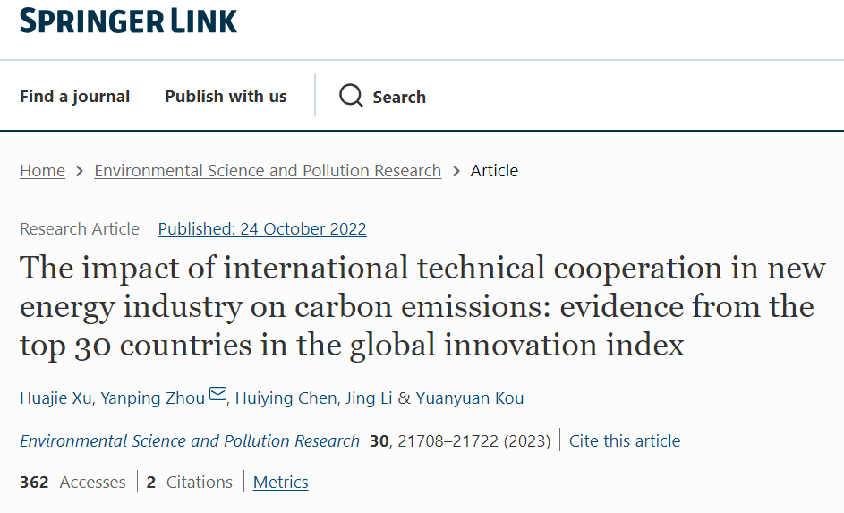 公司硕士生徐华杰(导师:周衍平教授)的论文“The impact of international technical cooperation in new energy industry on carbon emissions: evidence from the top 30 countries in the global innovation index”在环境与管理领域国际期刊《Environmental Science And Pollution Research》(SCI,IF=5.8,中科院JCR三区)发表。