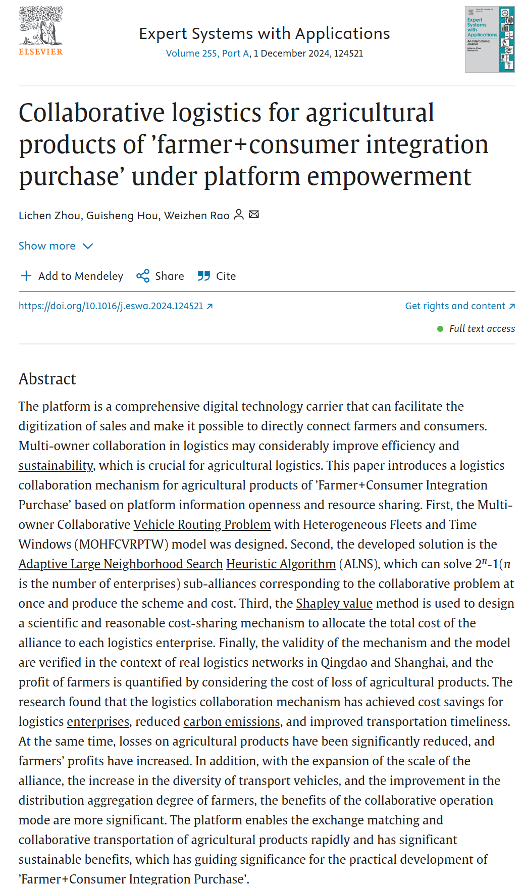 XC体育饶卫振教授团队发文 《Collaborative logistics for agricultural products of 'farmer plus consumer integration purchase' under platform empowerment》