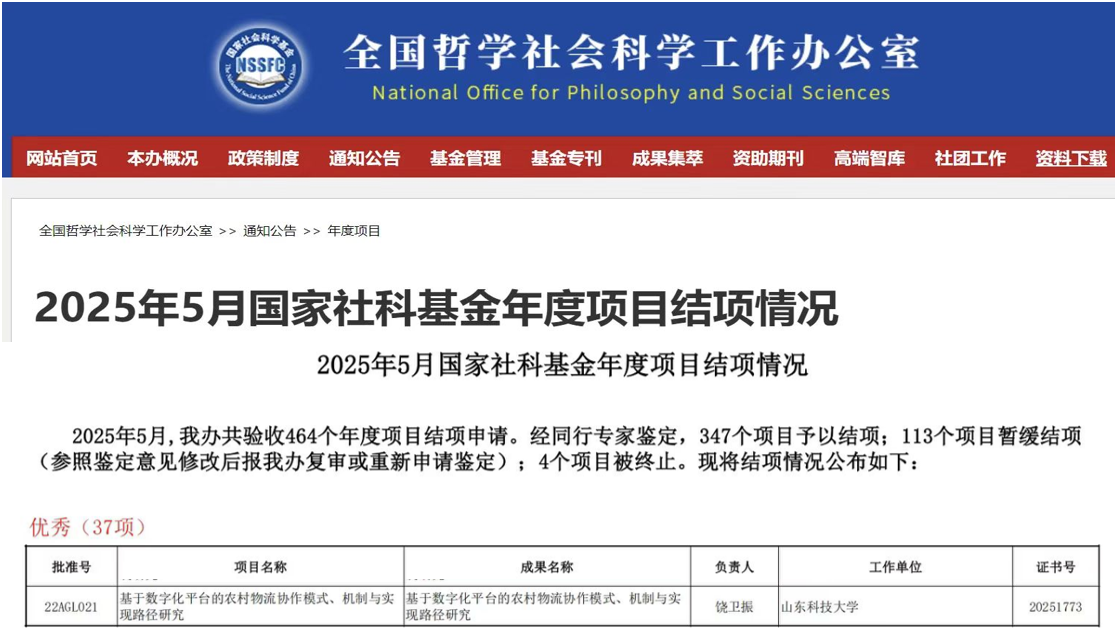 近日,全国哲学社会科学工作办公室公布了2025年5月国家社会科学基金年度项目结项情况,公司饶卫振教授主持的重点项目“基于数字化平台的农村物流协作模式、机制与实现路径研究”(项目批准号:22AGL021)成功结题,获评“优秀”等级。全国哲学社会科学工作办公室本次共验收464个年度项目结项申请,经同行专家鉴定,获评优秀等级项目37个,优秀率7.98%。