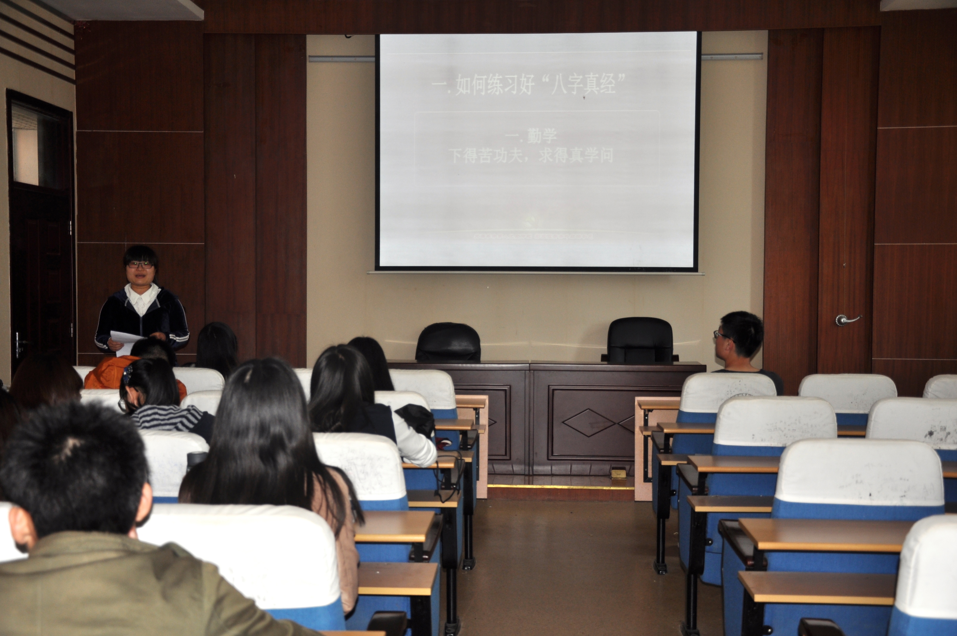 本次学习研讨会分为:如何练习好“八字真经”、学习习近平总书记讲话精神“四进四信”和专家报告学习及解读三个部分。首先,刘露向在座的同学们讲解了如何练好“八字真经”。她以习近平总书记在北大与师生座谈时强调的“扣子理论”为例说明了抓好青年这一时期的价值观养成的重要性。她分别阐明了“八字真经”——勤学、修德、明辨和笃实的深刻内涵,并倡导广大青年从现在做起,从自己做起,勤学、修德、明辨、笃实,使社会主义核心价值观成为自己的基本遵循,身体力行,努力在实现中国梦的伟大实践中创造自己的精彩人生。随后,闫娜向在座同学传达了习近平总书记提出的 “四进四信”的深刻内涵。她呼吁大家主动参与到书写“中国梦”的队伍中,并表达了早日实现“中国梦”的美好祝愿。最后,周琛带领在座同学作专家报告的学习及解读。他解读了中国人民大学王向明所作的“以‘四个全面’战略布局统领中国进步发展”的报告、林泰所作的“坚持中国道路 引领社会思潮”的报告以及王民忠所作的“高校员工思想教育的价值及其体现”的报告。其中包括反腐倡廉、环境污染、思想教育等众多当今社会的热点问题。