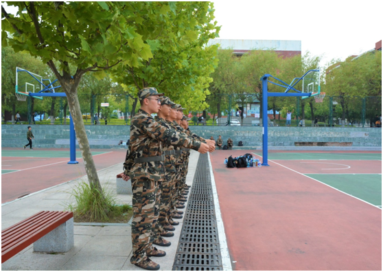 经管的女生们神情庄重,坚挺地伫立在操场上。尽管豆大的汗珠淌下脸颊,她们却没有丝毫懈怠。