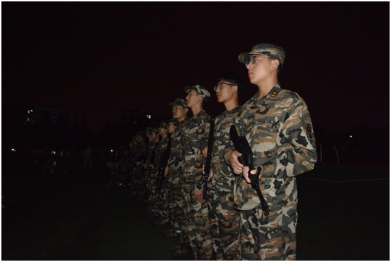 整齐划一的步伐,响彻行云的口号,如松般的军姿都是新生们青春蓬勃的写照。灯如星芒,闪耀夜空。即使在晚间,他们也没有半点的怠慢,认真训练。许多的同学克服了平日的惰性,忘却生活的优越,不断地充实丰富着自己。他们犹如战士一般,有一种纵横沙场的感觉。