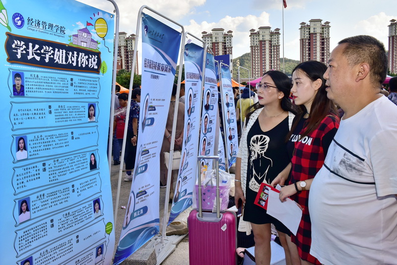 在迎新现场开展“我为父母敬杯水”感恩父母主题交活动,得到了家长的赞许和好评。"学长学姐对你说"宣传板,吸引了家长和新生的目光。
