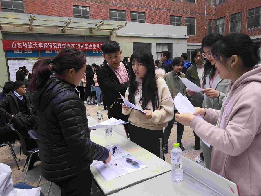 招聘会现场,应聘者手持简历,穿梭在人流之中,积极与应聘者交谈,主动了解用人单位的情况。招聘单位向同学们介绍公司的概况、职业发展方向、人员需求,双方在轻松融洽的气氛中交谈。青岛荣置地顾问有限公司是一家专业的不动产综合服务商,此次主要招聘置业顾问和营销策划等专业性人才。该公司人事经理吕校辉说:“来咨询的毕业生挺多的,半个小时已经有10余人提交了简历。”