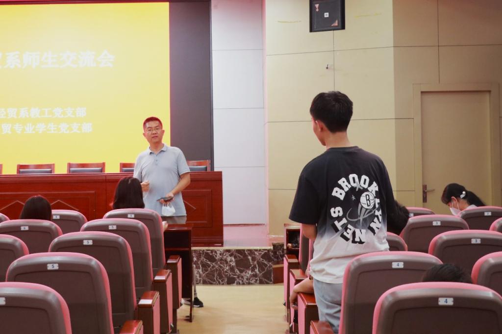 交流会上,侯贵生从就业和考研两个方向出发,通过真实案例建议国贸专业的同学们提升就业能力,指出了在考研备考中应当注意的问题以及报考院校选择策略等内容。经贸系党支部孙江永老师根据同学提出的毕业论文等相关问题,强调了将知识应用于解决现实问题的重要性,并就毕业论文的写作方法和对科研细节的把握做了详细说明。赵金凯老师和李淑云老师回答了同学们提出的老员工科技竞赛和课程学习方法等方面的问题。