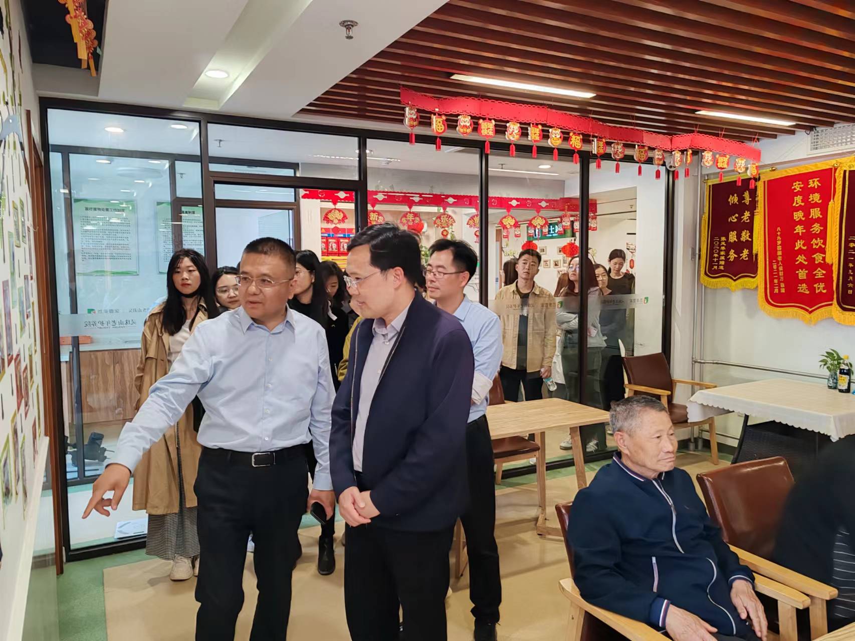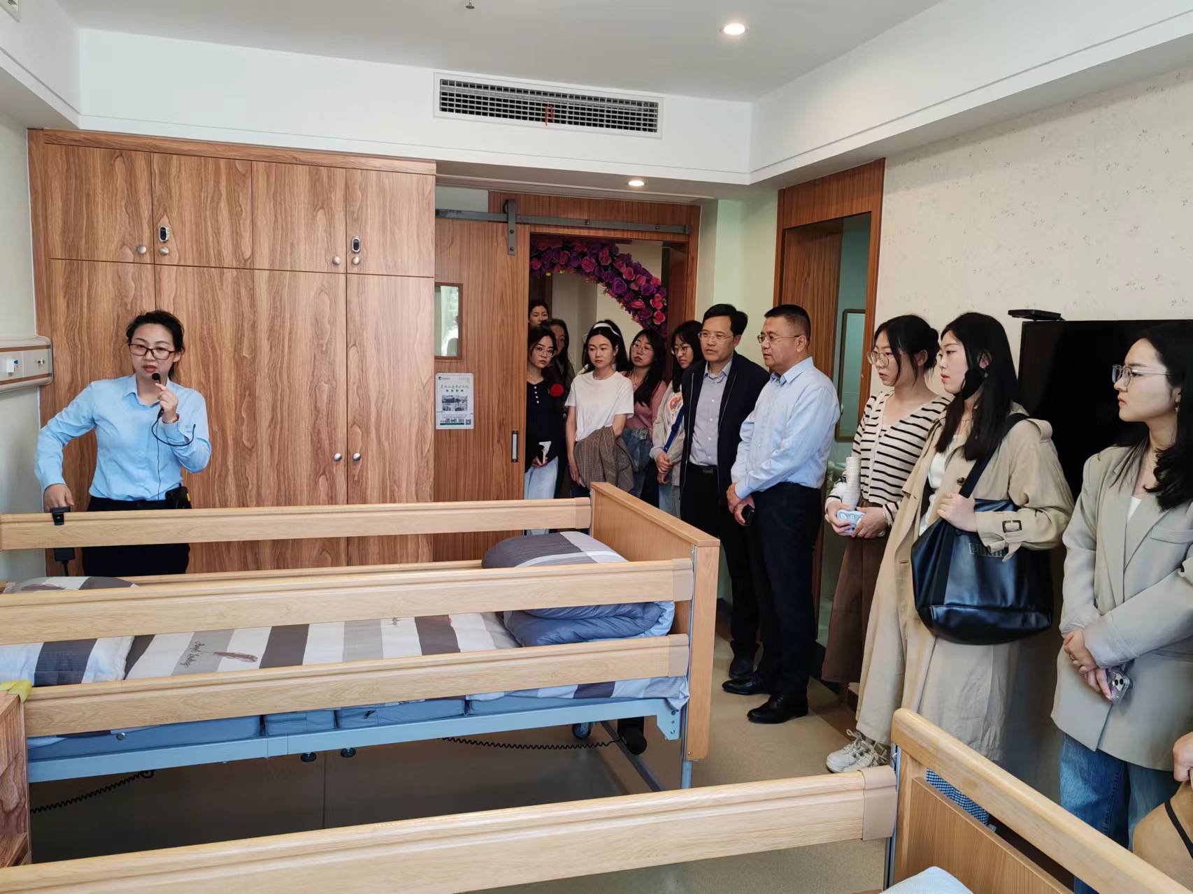 公司师生代表在工作人员带领下参观了首康壹家灵珠山老年护养院。首康壹家灵珠山老年护养院位于灵珠山街道,占地面积12000㎡,设有床位228张,引进日本养老服务的先进理念、配备德国的养老服务设备设施,整合新区的养老、医疗服务资源,主要为失能、失智、半失能、自理老人提供医、养、康、乐、护于一体的全功能综合性养老服务。