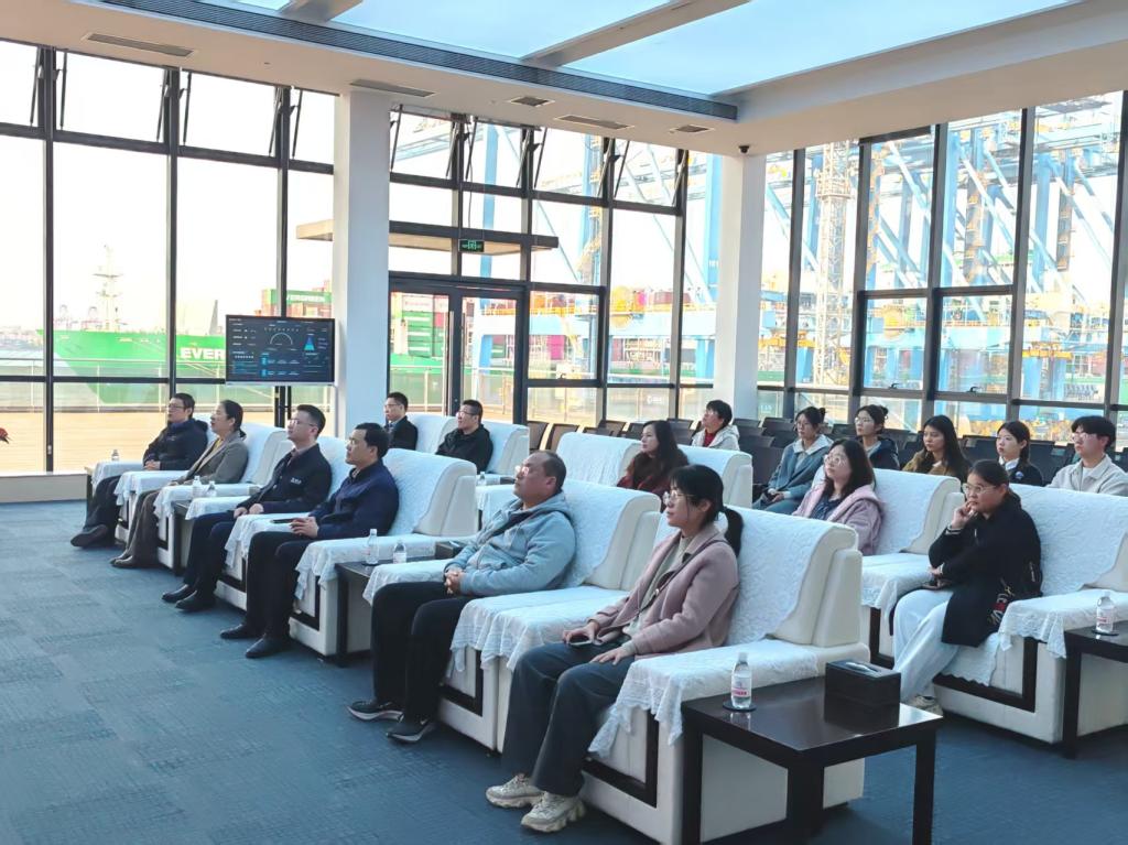 随后,师生代表观看了山东港口宣传片、自动化码头宣传片,了解了自动化码头自主创新、突围破壁的建设历程,凭借“拼命都不一定干得好,不拼命肯定干不好”的创新精神,“连钢创新团队”实现了“五项突破”和十余项全球首创技术,取得了一大批具有自主知识产权的科技成果。大家步入观景平台近距离观摩自动化码头作业现场,全方位感受全球领先、亚洲首个真正意义上的全自动化集装箱码头带来的“中国速度”。期间,公司师生围绕“技术迭代与人才培养适配性”“码头应急保障机制”等问题与码头工作人员展开深入交流。