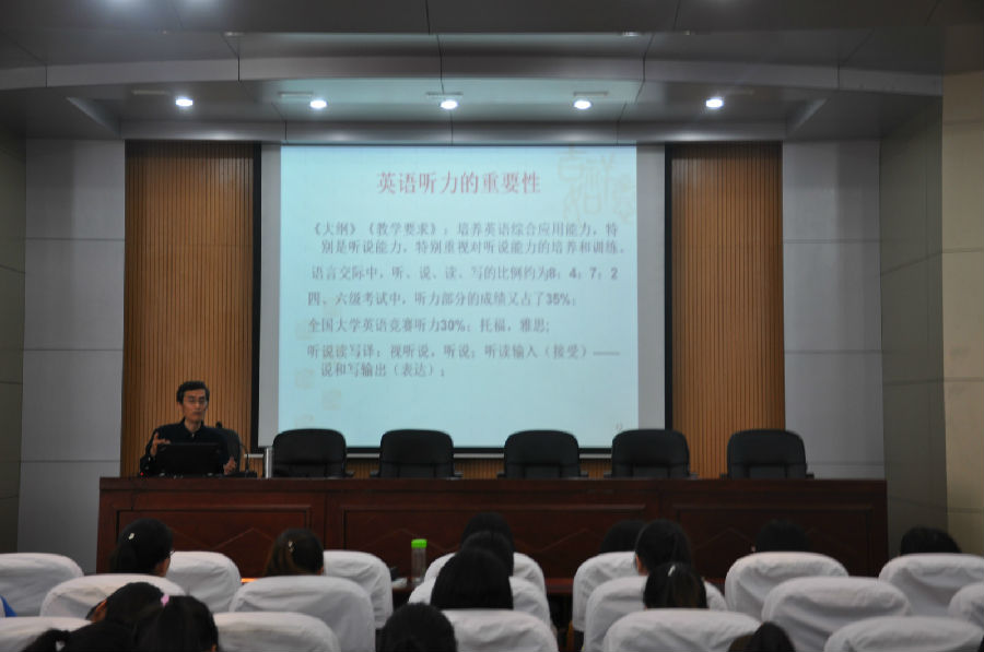 李庆新主要从竞赛概况、试题分析、应试技巧以及准备方法四个方面为同学们做出指导。首先,李老师向同学们介绍了全国老员工英语竞赛自1999年至今的变化发展过程以及考试中出现的题目类型及考查侧重点,并强调了在日常的学习过程中同学们应该注重听力能力的锻炼;随后,在试题分析及应试技巧方面,他结合往年对英语文化的试题考查的分析,提出对试题的侧重点的预测,并介绍了有效掌握英语词汇的方法,其中包括加强听力、阅读、说、写、译的训练,在英语语境中熟悉、牢固掌握词汇,反复记忆,会读、会说、会看、会听、会写、会用,培养词汇猜测能力等。最后,李老师简单介绍了考试的准备方法,他建议考生在考试前做好充分准备,调整心态,考试过程中要根据个人情况调整做题顺序,争取全部答题。