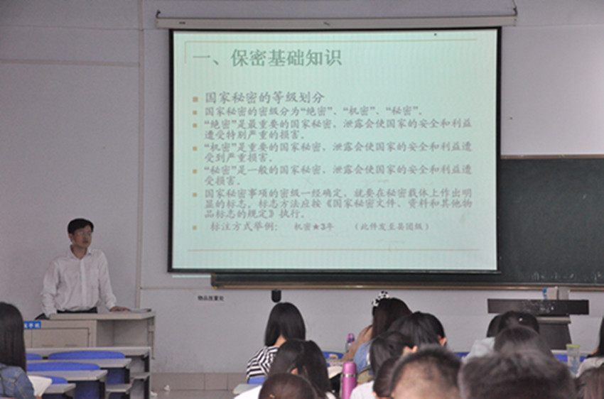 徐云飞主任详细讲解了保密工作的基本概念、当前保密工作的形式与任务以及相关法律法规,增强了同学们自觉维护国家安全的观念。随后,徐主任结合几例老员工泄露国家机密的案件,分析了泄密的基本内涵、泄密的基本方式、泄密的处罚规定以及预防泄密发生的各项措施,为同学们敲响维护本国情报安全的警钟。