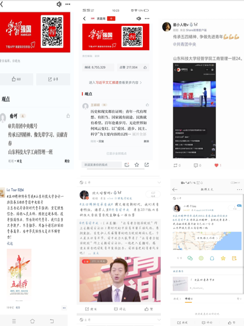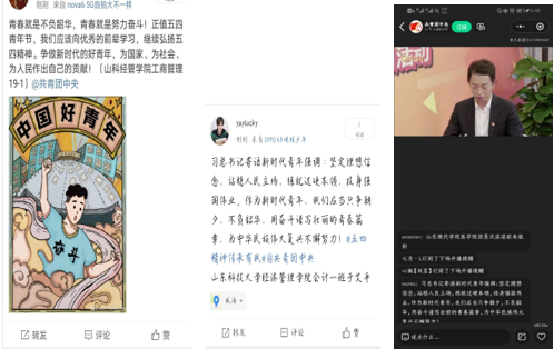 公司各团支部通过制作视频、海报、画报、文字等形式在学习强国、微博、微信、B站、抖音等平台@共青团中央,加大参与率和参与度。全院师生积极参与“我们都是收信人”活动,同时根据团中央的直播节目表,做好观看安排,保证参与直播的持续度。直播活动结束后,各团支部通过观后感撰写,主题团课讨论等形式提高学习效果。在“中国青年五四奖章”宣传展示、青春故事会分享等环节大家通过发送弹幕的形式积极参与到直播活动中,“我爱中国”、“五四精神 传承有我”等语句在直播屏幕上“刷屏”,吸引了团员们的大讨论。