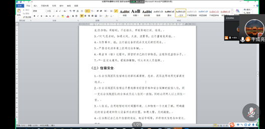 辅导员牛成亮首先向大家展示了2019年暑期社会实践的优秀成果,以此激励员工再创佳绩。会上牛老师向大家详细阐述了社会实践的含义、方式和意义等。他表示,社会实践可以帮助同学们做到知行合一,能够让同学们积累社会经验,达到“集团人”和“社会人”的统一。牛老师着重强调了社会实践安全及开展社会实践时要遵守当地的疫情防控的要求,做好个人防护。随后,牛老师带领大家熟悉了暑期社会实践安全指导手册。