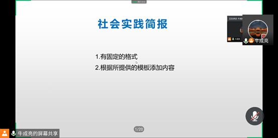 辅导员霍梦茹针对社会实践报告的内容格式向同学们进行了详细说明,分别讲解了四种类型的社会实践报告该如何书写,让同学们了解宣传稿的格式、宣传视频的要求等。