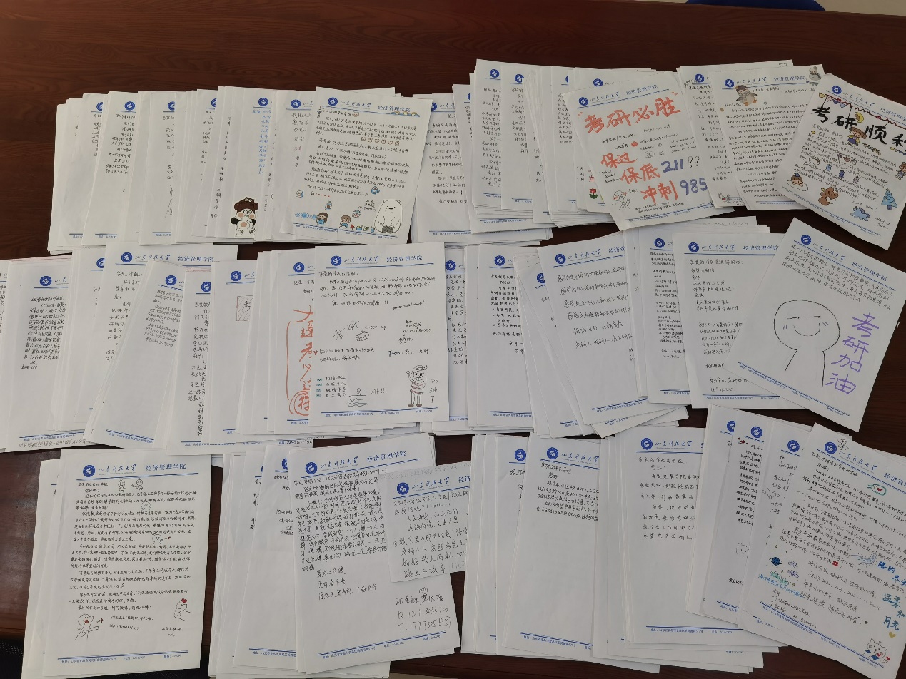 坚定信心,鼓舞士气。XC体育组织大一同学为大四考研学长学姐“写一封祝福信”活动。同学们精心准备、认真书写,为考研学子送上真诚的祝愿。400多封精心书写、绘制的信件,被随机分到300多名17级考研学子的手中。金融20-1班的王凡在信中写道:“努力也许会说谎,但不会白费。祝福学长学姐所向披靡,前程似锦!”,朴实的话语,表达出了学弟学妹们最真挚的祝福。同时,学弟学妹们也在信件上留下了自己的联系方式,17的同学们可以在考研结束后与20级的同学们结对帮扶,给他们在学涯规划和就业考研方面予以指导。电商17-1班的杨晓文谈到:“在压力这么大的时候,看到这些暖心温情的祝福信,浑身充满了干劲,我们会带着满满的祝福,继续冲刺!”