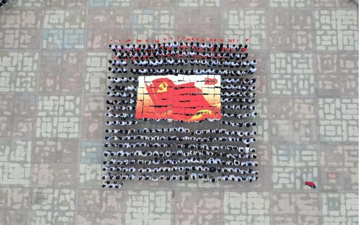 宣誓结束后,全体员工共同合唱《没有共产党就没有新中国》,在嘹亮的歌声中,同学们用手卡共同拼接出了党旗的巨幅画面。从空中俯瞰,飘扬的党旗诉说着每一位经管学子勇担使命、报效国家的坚定信心。
