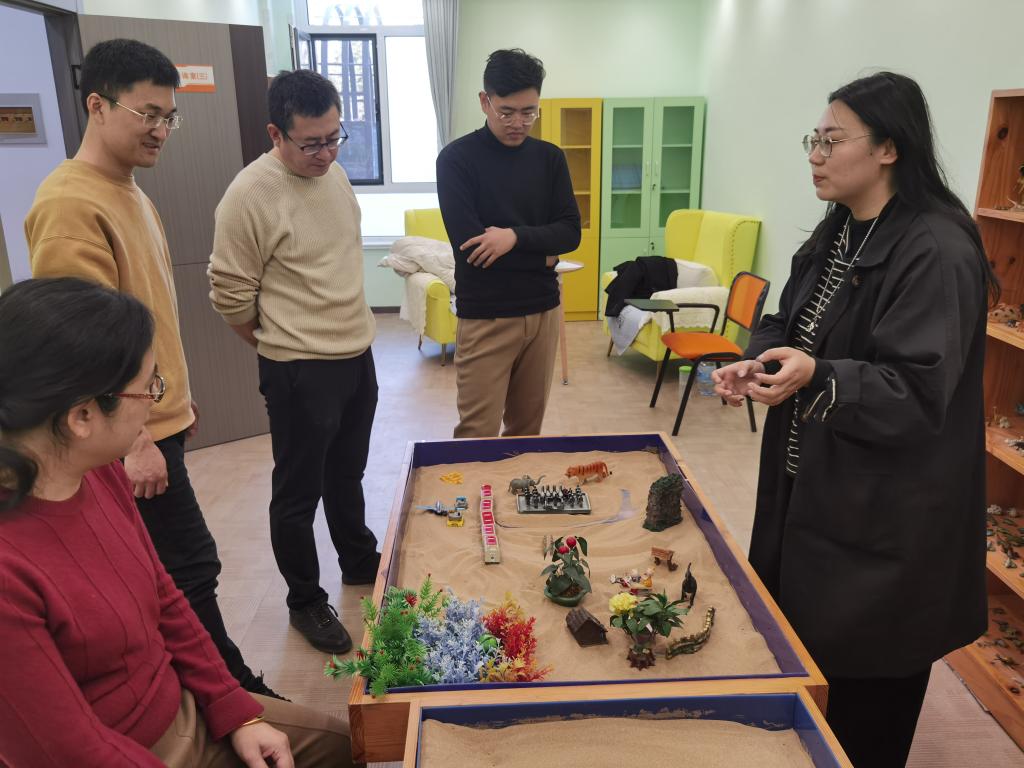 在参观过程中王桂清对公司心理功能室的设置进行了介绍,对心理咨询室、情绪宣泄室、沙盘模拟室、团体辅导室等场所的功能,进行了重点讲解。同时在讲解过程中,老师们体验了功能室的部分工具,对心理咨询和心理辅导有了更深入的了解。