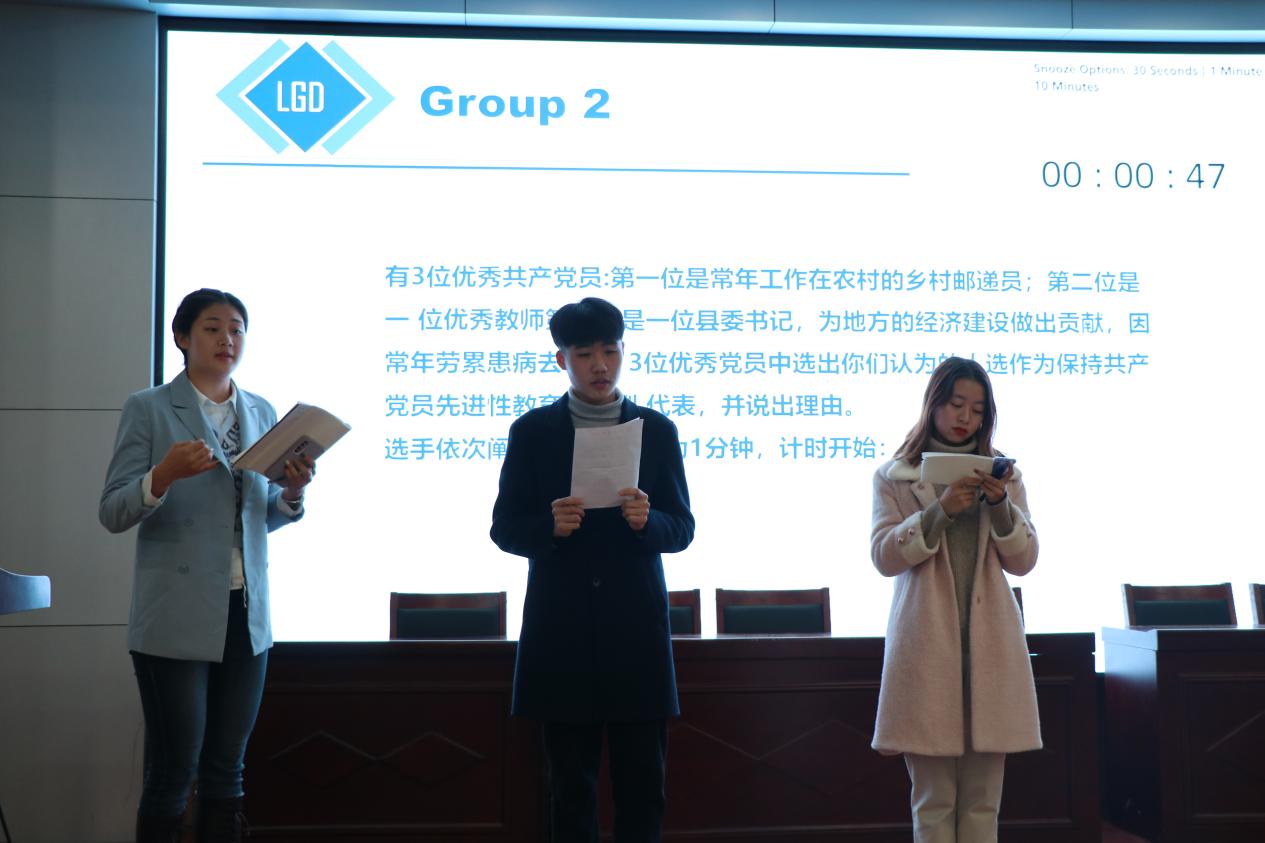 本次比赛由六组初赛晋级选手参加,分为两轮。第一轮比赛中,各组选手针对不同题材的问题进行个人以及团队讨论并上台阐述。比赛中场进行“心有灵犀”游戏,活跃了现场气氛,缓解了选手们的紧张情绪。第二轮比赛中,晋级选手再接再厉,对所持题目进行分析讨论,冷静沉稳的阐释了自己的观点。本次比赛过程中,选手们沉着自信,表述言简意赅,充分展现了自身的逻辑思维能力、语言表达能力、团队协作能力。比赛结束后,五位评委分别对选手的表现做出点评,指出了每位选手在展示过程中存在的问题并提出了建议。统计分数期间,大艺团王淑琪为大家带来精彩表演,现场掌声不断。