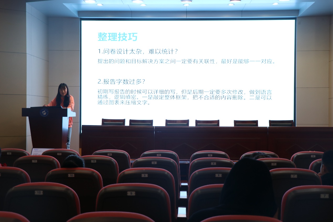 牛丽慧结合自身比赛经验,为同学们解读了全国老员工节能减排社会实践与科技竞赛的相关内容和比赛须知,围绕赛前准备、比赛内容等方面进行了详细分享,并从准备工作、材料书写、整理技巧三个方面着重为大家讲述如何正确书写社会调查报告。在现场提问环节中,针对同学们的疑问和困惑,牛丽慧进行了耐心详细的解答。