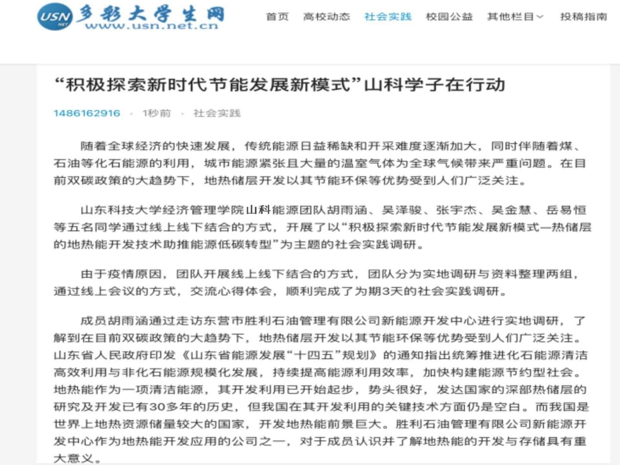 2022年1月19日至1月21日团队到山东省东营市胜利石油管理局新能源开发中心地热项目部进行了为期三天的社会实践调研。