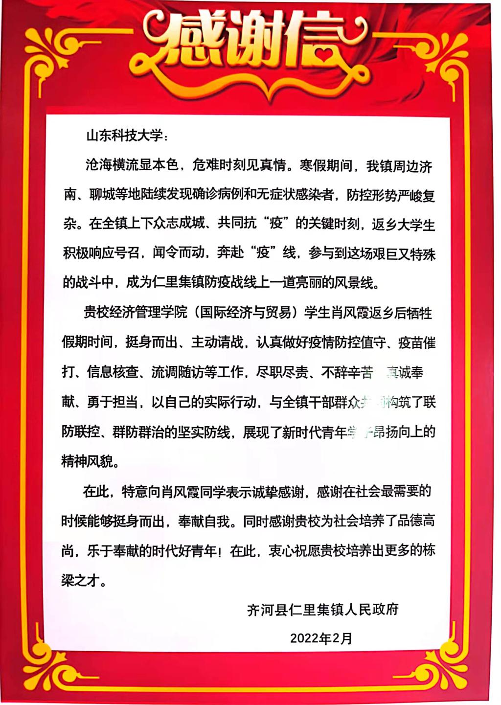 肖凤霞,系XC体育国际经济与贸易专业2020级员工,在2022年寒假放假回到家乡后,主动相应镇政府号召,报名参加了齐河县仁里镇的疫情防控志愿者服务工作,她认真做好疫情防控值守、疫苗催打、信息核查、流调随访的重要工作,尽职尽责、不辞辛苦,勇于担当,以实际行动展示了山科学子昂扬向上的精神风貌。