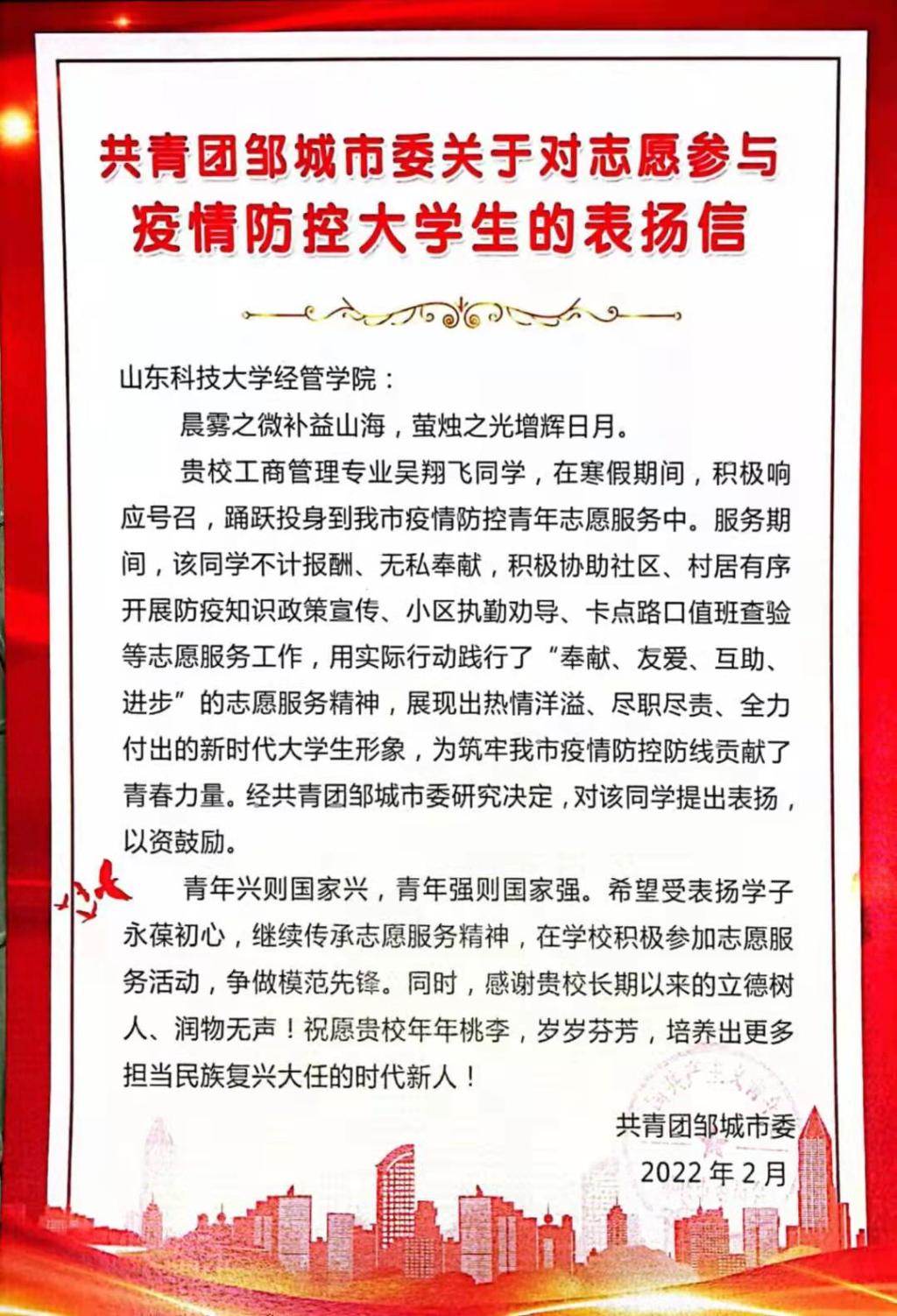她把疫情防控工作当做最重要的工作来做,扛起责任担当,以实际行动践行了“奉献、友爱、互助、进步”的志愿服务精神,展现出热情洋溢、尽职尽责、全力付出的新时代老员工形象,获得了共青团邹城市委的表扬。
