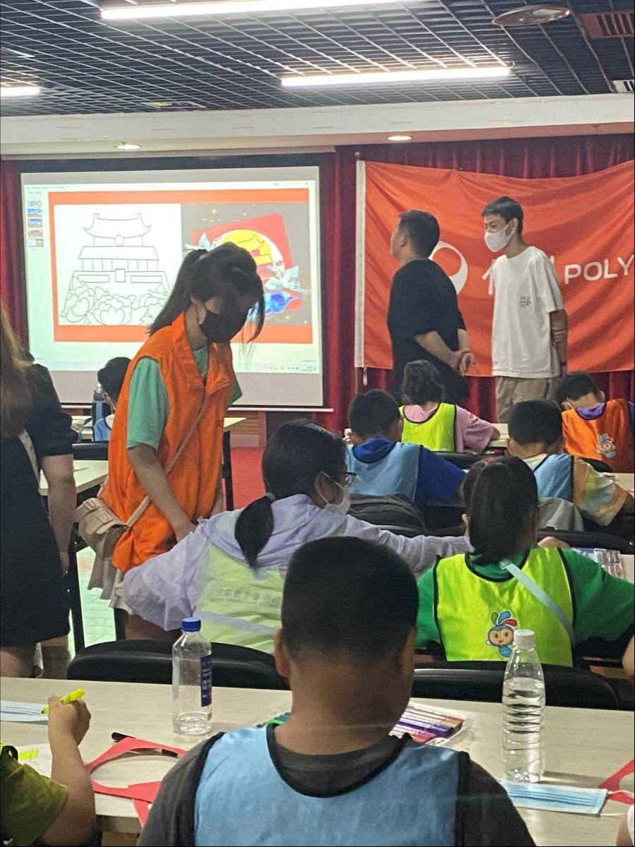 7月20日,在泰州市保利大剧院,实践队同学们一起陪伴暑托班的孩子们一起参观了大剧院,观看了话剧演员排练走台,并辅导了暑托班的孩子们完成了天安门的绘画。