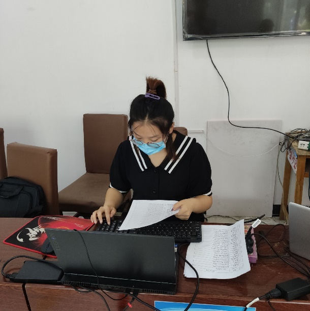 7月19日,早上6:30,她与同伴一起出发到小章村进行核酸检测的登记。村里的登记方式与公司不同,由于村里费用有限,无法应用高科技产品进行身份证扫描登记和电子身份证二维码扫描登记,只能一个一个手动输入系统。另外,因为放暑假员工都回到村里,人数增加到约八百人,工作量较大。她认认真真,从早上近七点一直录到九点半,保质保量完成信息录入工作。