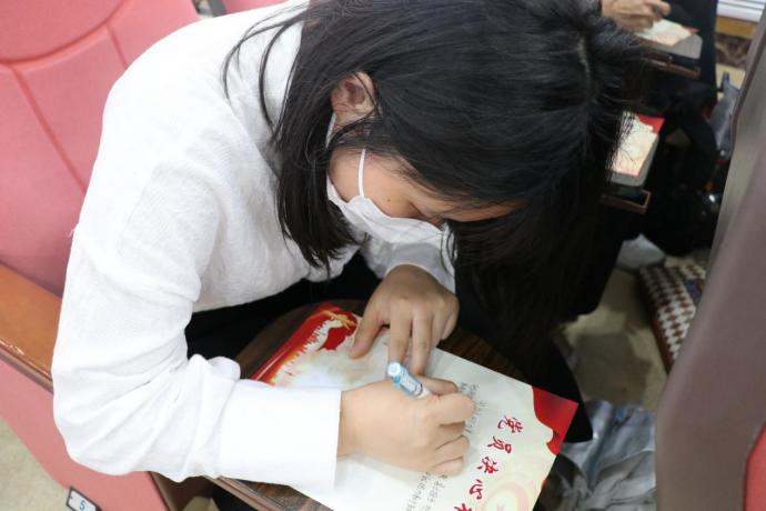全体党员写下党员决心书。全体毕业生党员在党员决心书上郑重写下对自己、对母校、对党和国家的承诺;他们的眼神坚定,面容严肃,字迹工整,笔力遒劲,每一个字都充满了对党的忠诚和对未来的憧憬,充满了真挚的情感和坚定的信念。