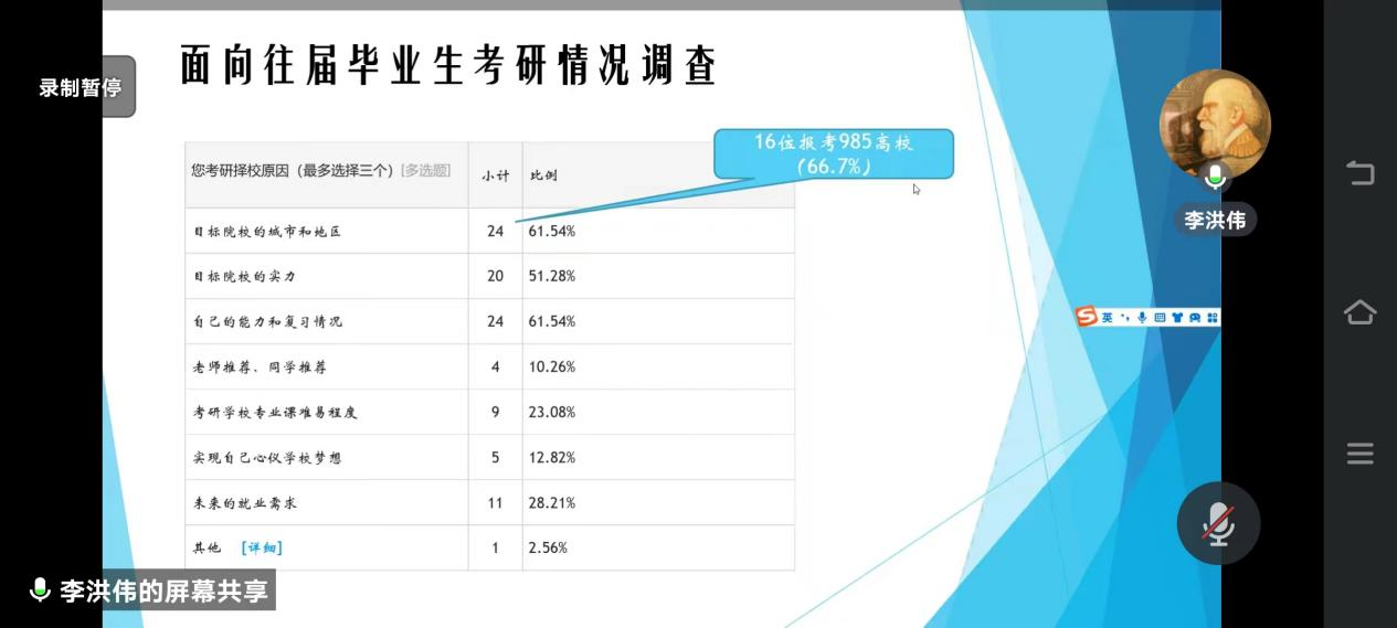 会后,各系分专业召开考研动员会。工商管理系主任李洪伟以线上方式参加2021级工商管理专业考研动员会,辅导员范文洁主持会议。李洪伟介绍了工商管理专业考研方向,分析了公司历年考研情况,为同学们阐释了考研的利弊,鼓励同学们早做准备,坚定信心,踏实复习,定会取得好的成绩。