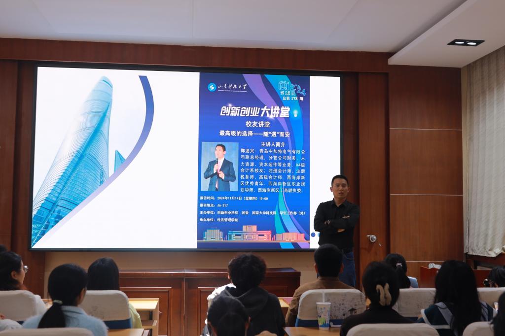 郑龙兴副总以自身经历为切入点,讲述了从校园到职场,再到创业领域的经验与收获,同时结合历史背景深入剖析了当前创新创业的市场环境,用生动的案例与精准的数据为同学们展示了行业的现状与未来趋势。在互动环节,同学们积极提问,就创业项目选择、创新创业准备、能力学历比较等诸多方面与郑龙兴副总经理进行了交流。