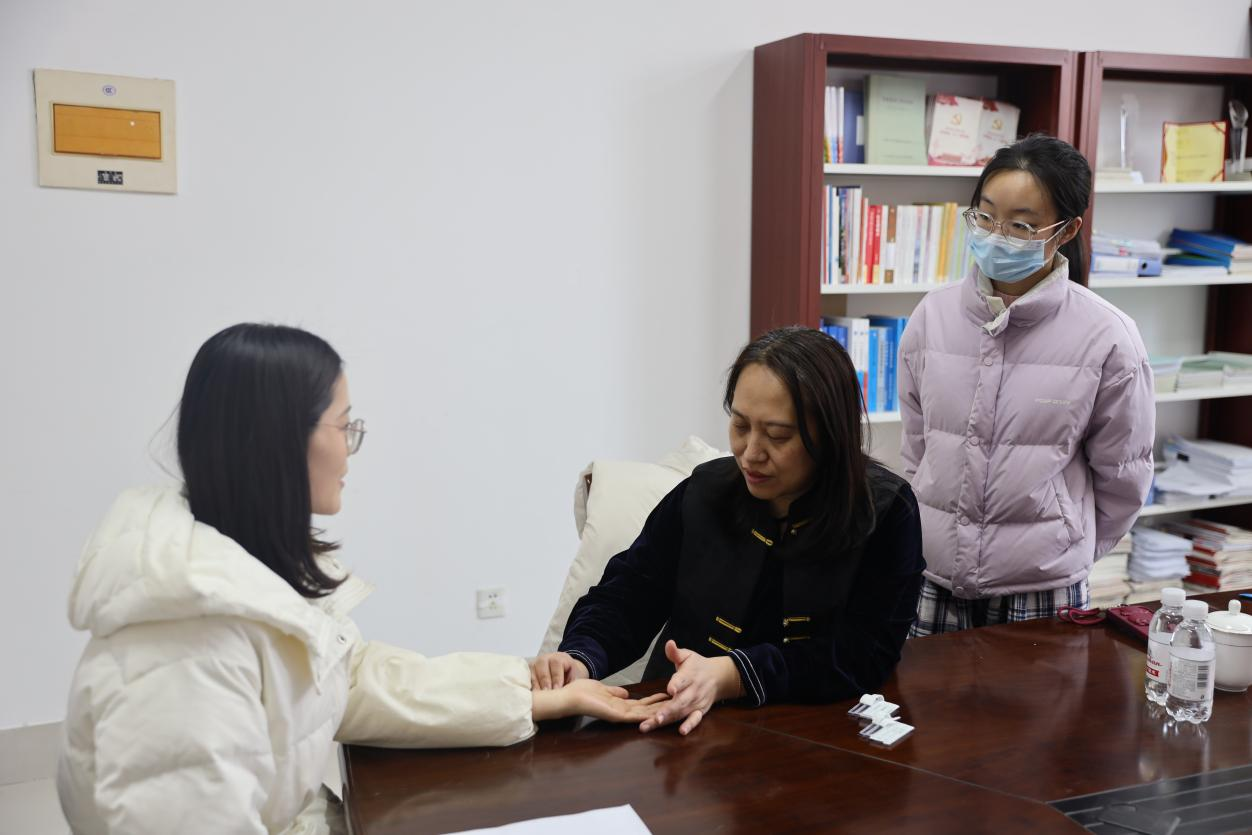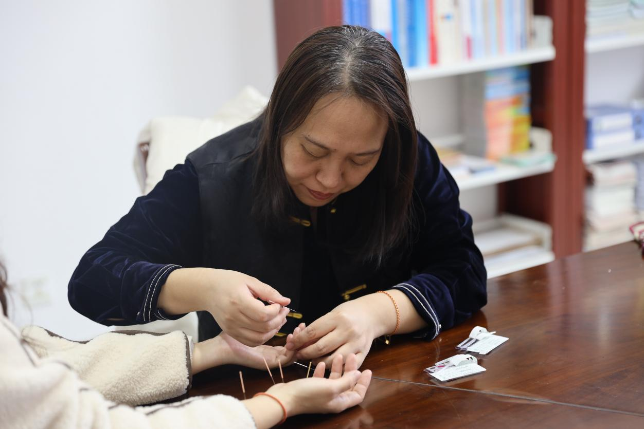 孙迎春医生以“望、闻、问、切”四诊为基础,通过观察舌苔、面色,把脉问诊,询问生活习惯,提供个性化体质辨识、药膳食疗建议。针对师生普遍关注的症状,孙医生现场演示中医针灸疗法,选取关键穴位施针,讲解其功效,宣传普及女性健康知识。