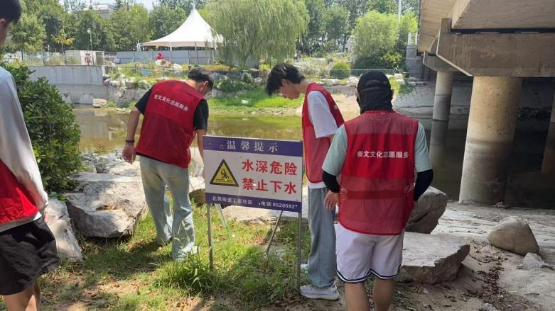 实践团队按照“分区负责、定点巡查、动态监管”原则开展工作。巡查前,队员们会提前熟悉各水域的地理位置、周边环境及潜在风险点,明确当日巡查重点。行动中,分组对虞河沿岸、张面河景观带、白浪河湿地公园等重点区域进行“拉网式”排查,一方面仔细检查水域周边的安全警示牌是否清晰完整、救生圈和救生绳等应急设施是否齐全可用,对发现的3处破损警示牌及时反馈给相关部门更换,为2处缺失救生设备的点位补充了物资;另一方面主动向在水域附近纳凉、玩耍的青少年及家长发放防溺水宣传手册,讲解“六不准”等安全知识,现场演示自救方法,提醒家长履行好监护责任。