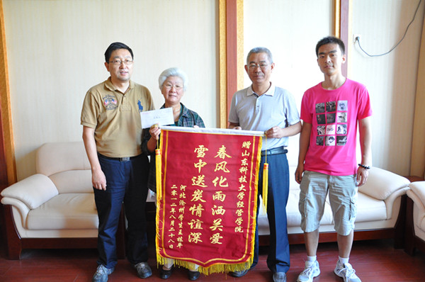 2012年9月5日,曾饱受尿毒症病痛之苦的公司XC体育电子商务专业2006级同学王栋平和母亲徐女士再次回到了公司,献上感谢信和锦旗,感谢公司老师和同学们在其生病期间给予的大力支持和无私帮助。公司党委书记吴高波、经理王新华、党委副书记刘洪锋、院团委付晓老师与母子俩进行了亲切交谈。